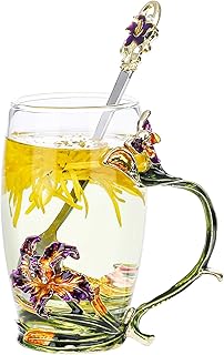 COAWG フラワーガラス ティーカップ 12オンス エナメル ハンドメイド クリアコーヒーマグ アイリス フラワー 装飾 女性 姉妹 奥様 母 クリスマス 感謝祭 新年 (12オンス-アイリス)