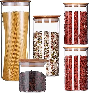 積み重ね可能キッチンキャニスターセット 5個パック クリアガラス 食品保存ジャー 容器 気密竹製蓋付き キャンディ クッキー ライス 砂糖 小麦粉 パスタ ナッツ用