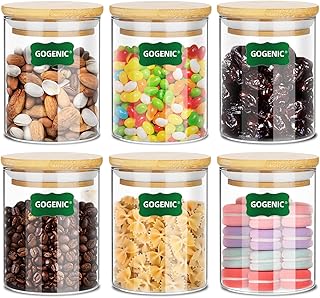 Gogenic 16オンス ガラスジャー 食品保存用 気密食品容器 竹の蓋付き キッチンキャニスター 砂糖 キャンディ クッキー ライス スパイスジャー (6個セット)