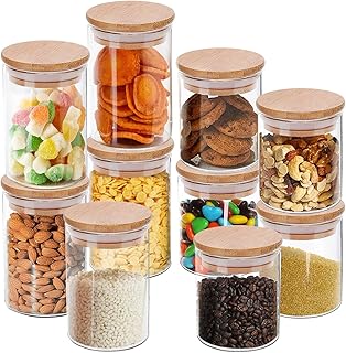 ガラス製食品保存容器ジャーセット 10個パック 円柱ガラス キッチンストレージセット 竹の蓋付き キャンディ クッキー 米 砂糖 小麦粉 パスタ ナッツなどに